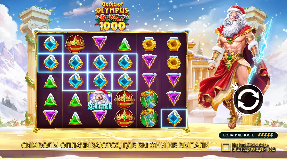 Is it worth playing: If you are a fan of the original series and want a festive mood — definitely yes. However, for a serious “hunt” for maximum wins, it is better to stick to the classic Gates of Olympus 1000 with a higher probability of max payout.