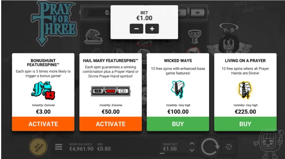 Pray for Three is not just a slot, it’s a mystical journey into a world where every spin can become an act of redemption or a path to big wins. The unique Wheel of Sin mechanics, atmospheric gothic theme, and 13,333x win potential make this game an outstanding representative of high-volatility slots.
